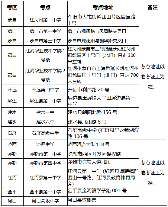 考试期间,红河州招生考试办公室将设立举报箱和举报电话,举报箱设在红河州教育体育局,地址:州行政办公中心C区5楼,举报电话:0873-3732960。各考区咨询举报电话:开远市0873-7123392、蒙自市0873—3856940、屏边县0873-3224636、建水县0873-7613224、石屏县0873-4857250、弥勒市0873-6122374、泸西县0873-6621391、红河县0873-4621222、金平县0873-5224335、河口县0873-3456522,3451413。
