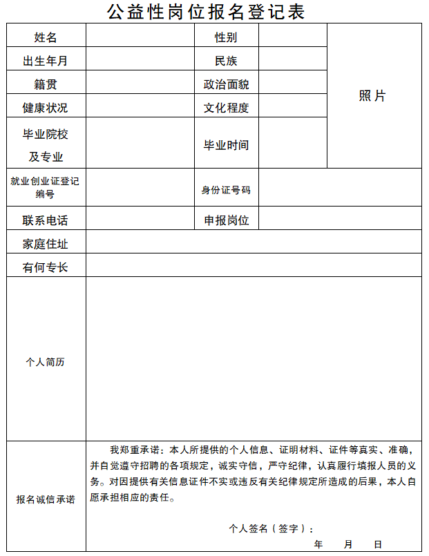 报名方式:采取现场报名的方式进行。报名时需提供《云南省就业困难人员认定申请表》、本人居民身份证复印件1份、就业失业登记证2页-7页复印件1份、学历证书及其他相关证明材料的原件和复印件1份,填写《公益性岗位报名登记表》1份。