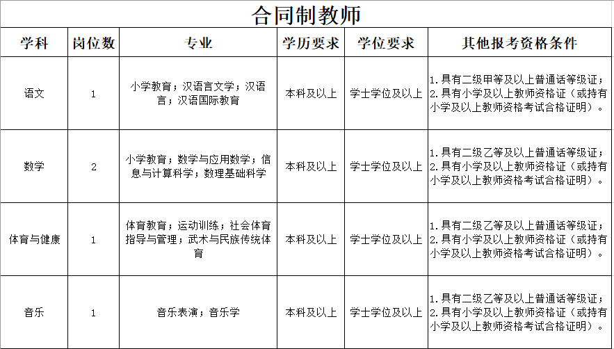 2.专业要求:所学专业与招考专业相符,具有小学教师资格证及以上(或相应教师资格考试合格证)和普通话证书(二级乙等及以上)
