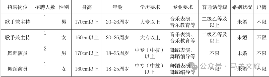 歌手兼主持人:要求具备良好的声乐演唱能力,熟练掌握多种声乐演唱技巧,如美声、民族、通俗等唱法;形象气质佳,普通话标准,具备较强的舞台主持能力和语言表达能力;有丰富的舞台表演经验,能够独立完成歌曲演唱和主持任务。