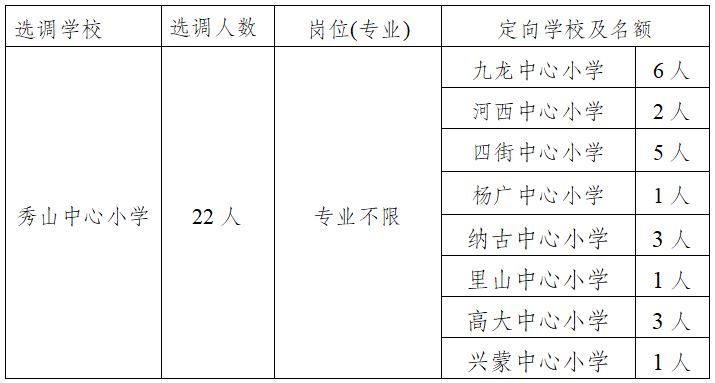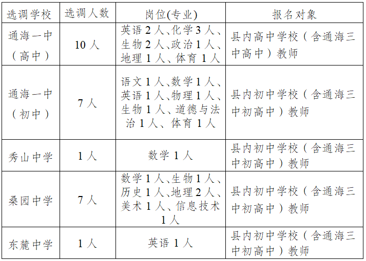 按照中共通海县委编制委员会下达的编制使用计划,2025年通海县教育体育系统拟在本系统内公开定向选调高中教师10人、初中教师16人、小学教师22人,选调岗位、人数及相关要求如下: