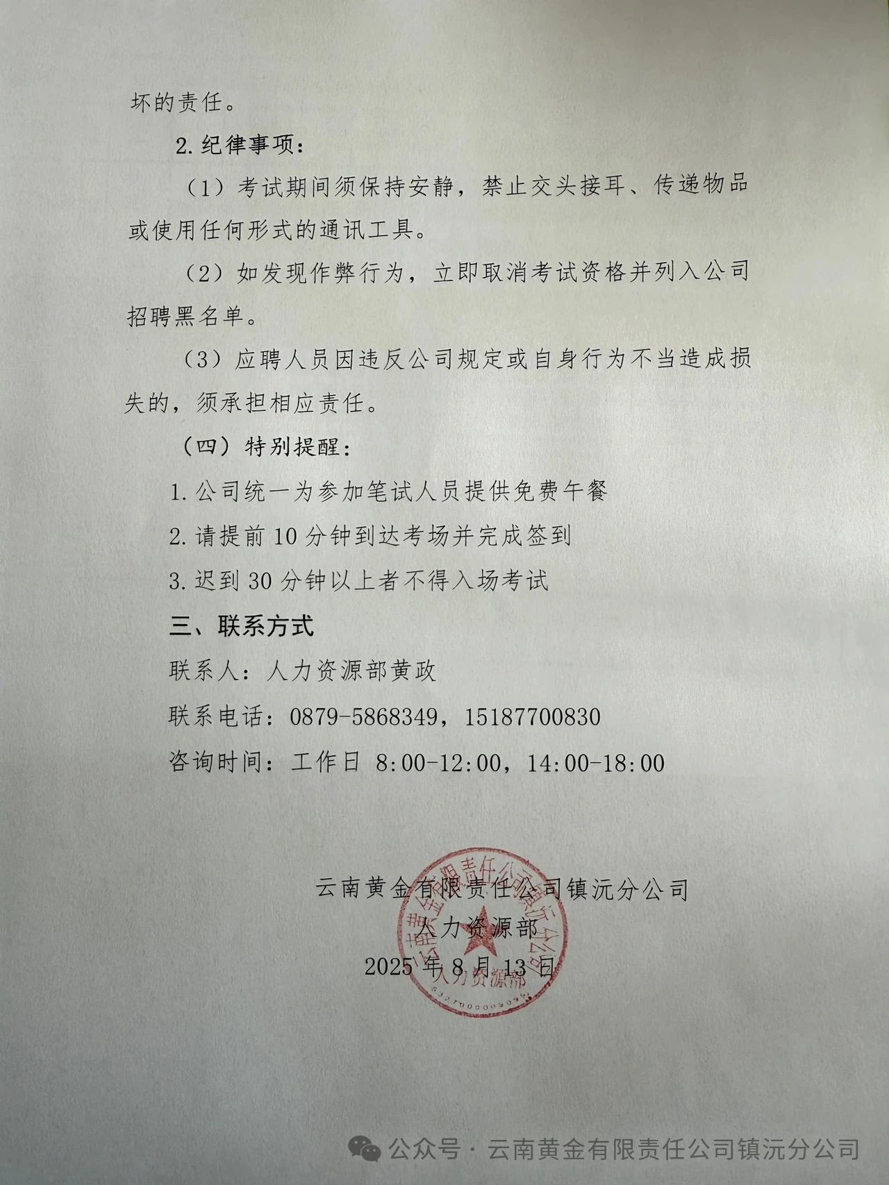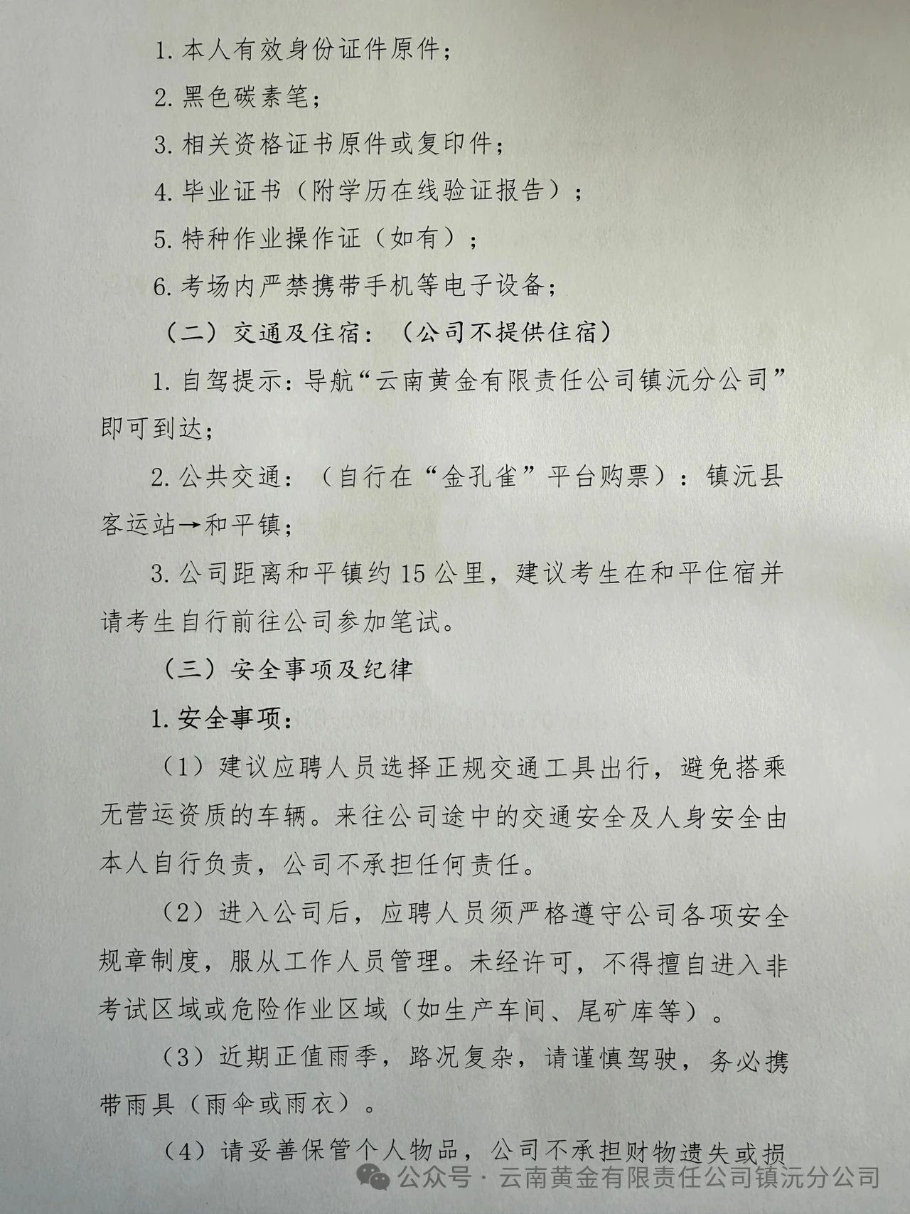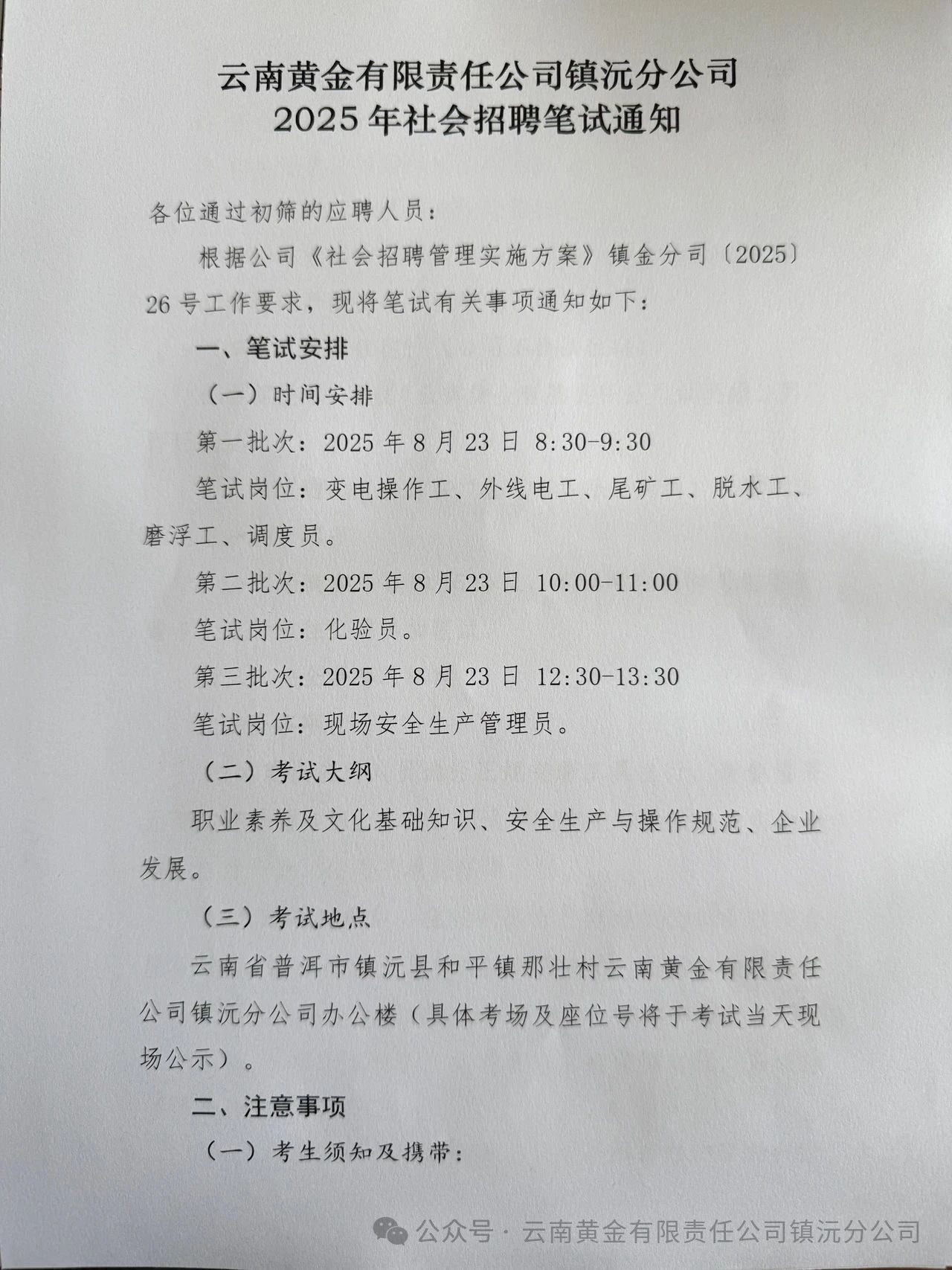 云南黄金有限责任公司镇沅分公司2025年社会招聘笔试通知