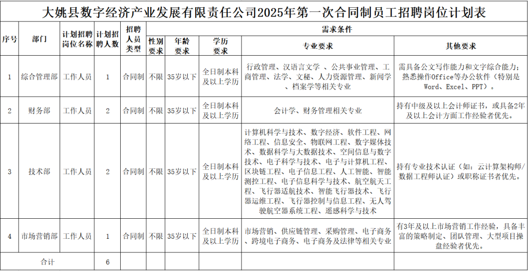 大姚县数字经济产业发展有限责任公司2025年度(第一次)计划招聘合同制员工6名,具体招聘岗位、人数及招聘条件要求如下: