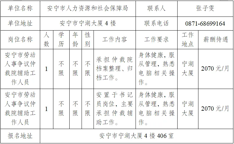 根据《云南省人力资源和社会保障厅 云南省财政厅关于印发云南省城镇公益性岗位管理暂行规定的通知》(云人社通〔2024〕25号)文件要求,按照公开、公平、公正的原则,面向社会公开招聘公益岗位人员2名,现将有关事项公告如下: