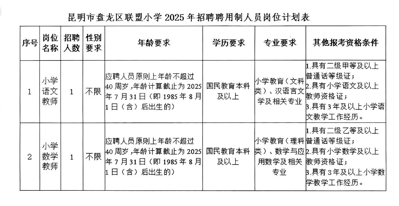 昆明市盘龙区联盟小学2025年招聘聘用制教师公告