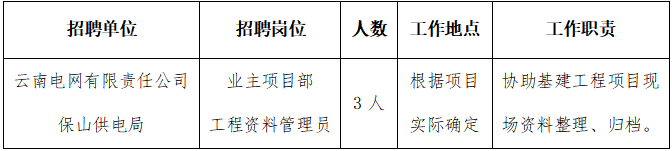 为支撑业务发展,解决临时性、短期性人力资源紧缺问题,依据国家法律法规及公司规章制度规定,结合保山供电局实际情况,现面向社会公开招聘短期项目制用工3人,具体事项公告如下: