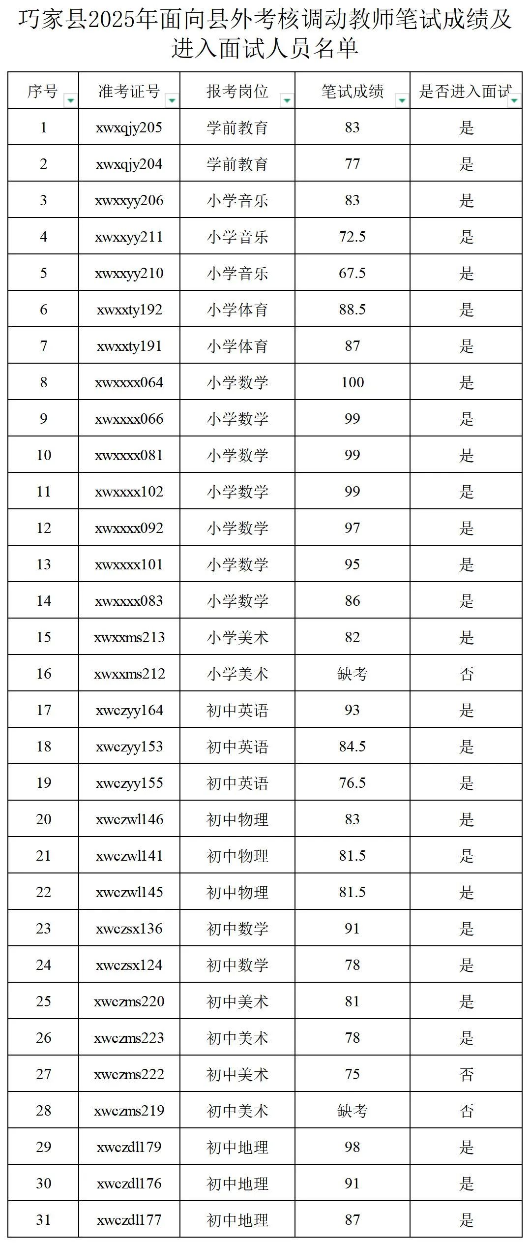 2.巧家县2025年面向县外考核调动教师笔试成绩及进入面试人员名单