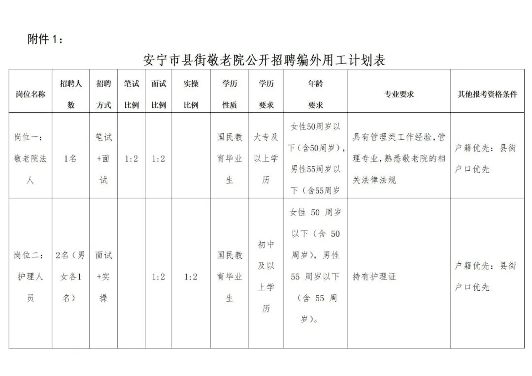 因工作需要,安宁市县街敬老院现面向社会公开招聘法人1名、护理人员2名。现将有关事项通告如下: