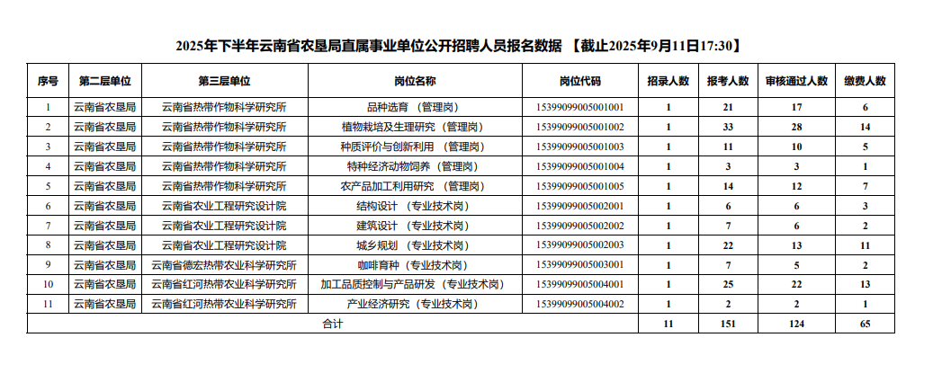 现将2025年下半年云南省农垦局直属事业单位公开招聘人员报名数据【截止2025年9月11日17:30】公布如下: