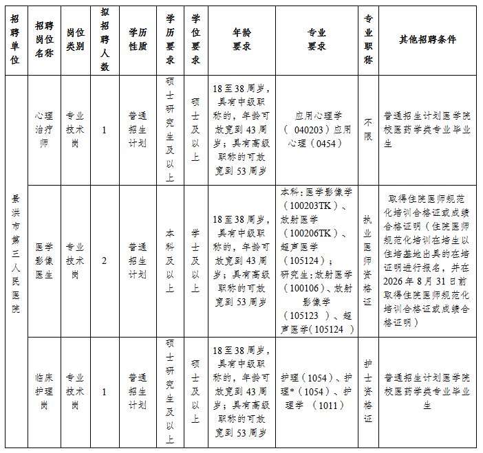 计划招聘3个岗位4人,具体聘用岗位、人数和条件详见《景洪市第三人民医院2026年急需紧缺人才考核招聘岗位表》