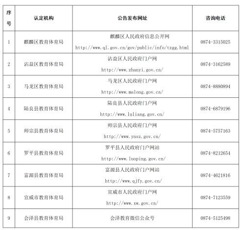 (五)各县(市、区)教育体育局认定公告查询网址及电话。
