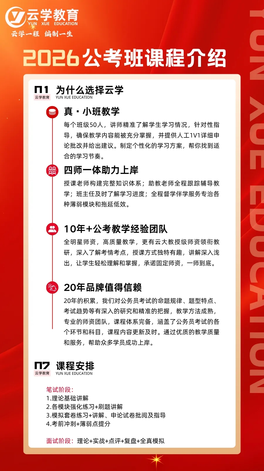 理论基础讲解,各模块强化练习+刷题讲解,模拟套卷练习+讲解,申论试卷批阅及指导,考前冲刺+薄弱点提分。